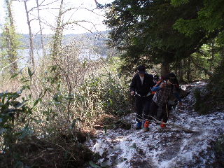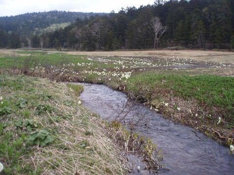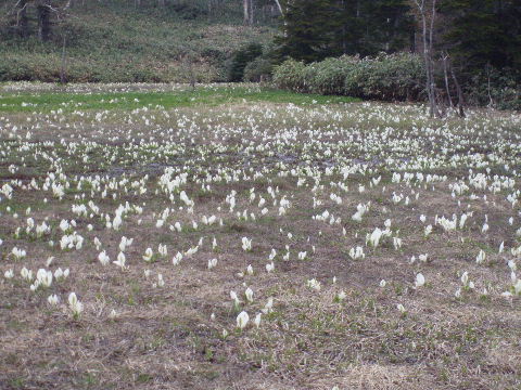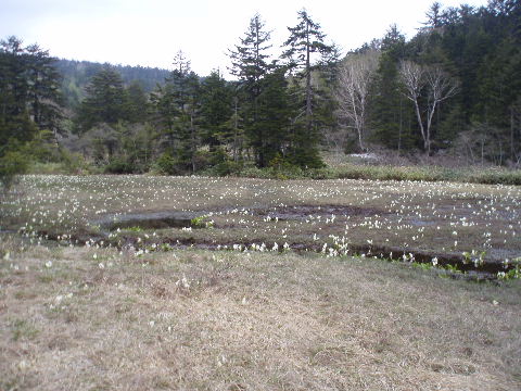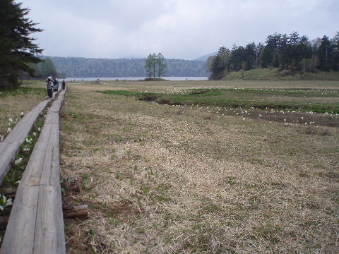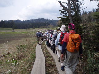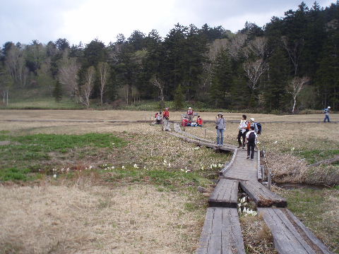 引き返し、再び大江湿原へ コチラのコースはツアーとのすれ違いも多かったのですが、 あるツアーは皆、縄アイゼンを着けていました。 靴に縄を縛っただけですが、 雪道と土道で、馴れない人には安全だと そのツアーに感心してしまいました。 |