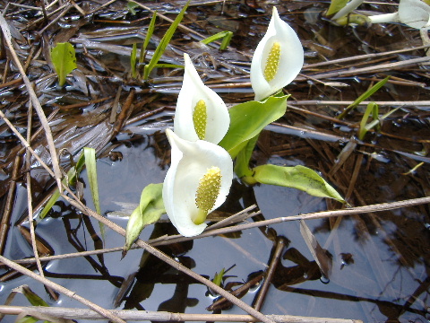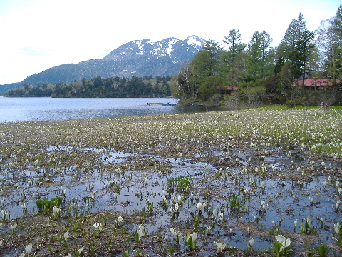 | 燧ケ岳と尾瀬沼。写真だけ写して先に進みます。この日晴れていたのですが、逆さヒウチはおあずけ。 でも早速可愛い水芭蕉の登場です。 |
