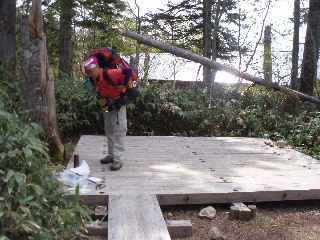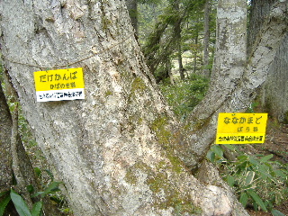 少し先まで行ってしまいましたが、 戻ってきて沼山峠展望台。 オオシラビソとコメツガの森は開け 尾瀬沼がもっと広範囲に見えるのかと 思っていましたら、ほんの少し 見えただけでした。 |