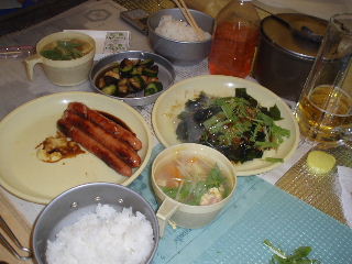 メニューは ブイヨンスープ(ベーコン、じゃが芋、人参、玉葱、水菜、卵) ウィンナー(油炒め) ジャコ入り海草サラダ ガーリックチーズ キュウリと茄子の漬物 ごはん(米を炊いたもの) & 梅酒、生ビール(小屋で購入700円)、発泡酒・・・^_^; ということで、トシちゃん撃沈・・・ 翌日へ |
