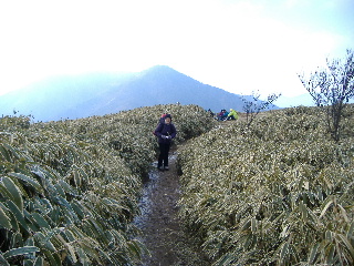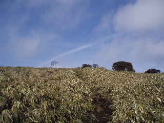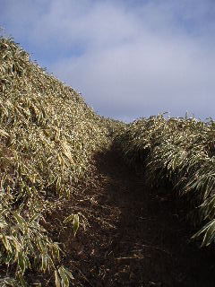 | 両脇笹の登山道を右に左にと九十九折れで登っていきます。 富士山を振り返りながら登って行きました。 |