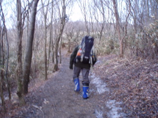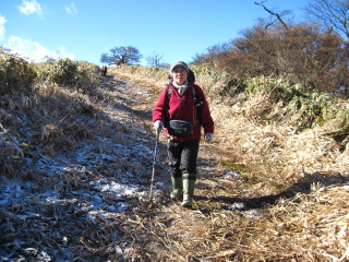 下山時は霜が融け、泥んこ道になるので足拵えは今回も長靴。これはインナーも入れてありますので温かです(下山時は熱いほどでした^_^;)。 たまたまスパイク付きの渓流釣り用を戴きましたので泥んこ道の下りには滑り止めになって重宝しています。ただこれは柔らかいので長時間ですと足の裏が痛くなってしまいます^_^; |