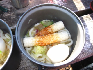 | 山頂でかけうどんにしました(^^ゞ ガスヘッドはコッヘルもずっとジェットボイルので済ませていたのですが、専用のコッヘルでないとやはり火力が弱いのか、先日の寒風吹きぬける蓼科山頂ではお手上げでした^_^; 今回はもちろん快調でしたよ(^^♪ | ![]() |