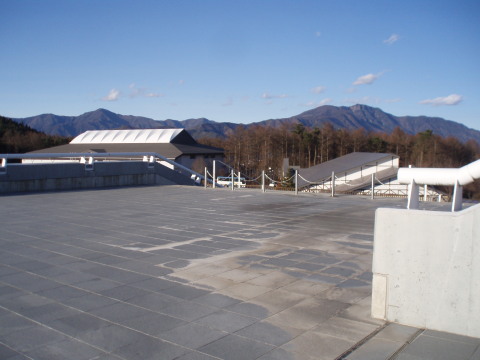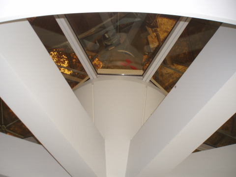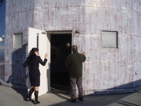 館内の階段を昇り、内側から 動くレーダーを見上げた所です。 ドームの内側は茶色くくすんで見えます。 そのパネルは見本を触ってみましたが 意外にも薄く軽いものでした。 ![]() |