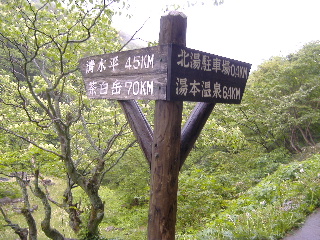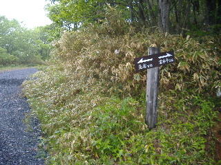 | 時間が間に合えば入りたいと思いながら標識に従って下りて行きます。三本槍岳とは書いてありませんね、那須連山の最高峰なのに。 | |