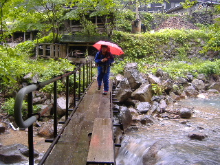 | ちょっと分かりにくいですが、北温泉の脇を通るように進むと橋がありました。 | |