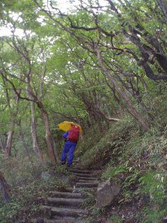 | 雨に濡れた新緑がきれいです。いきなりの急坂ですがのんびり行きます。 | |