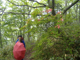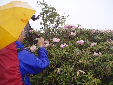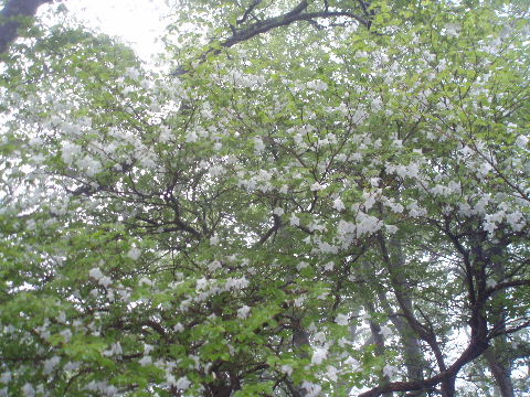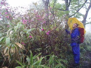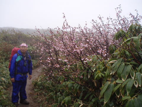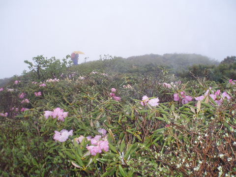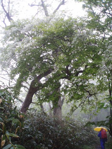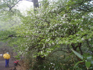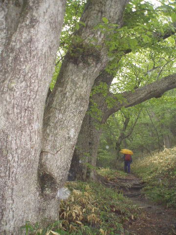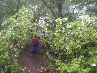 | 那須のシロヤシオを見たいと思っていたのですが、天気やら予定やら、なかなか思うようにいかないものです。昨年よりは少し開花が早かったようで満開の時期は逃しましたが、それでもラッキーなことに満開の木が少しだけ待ってくれてました。三本槍岳山頂は2回目。前回(H12年4月)は雪、今回は雨で展望はまたもや残念。 | ||