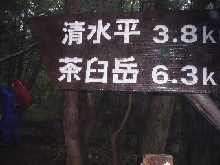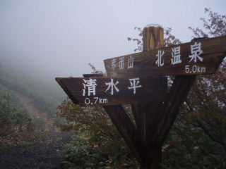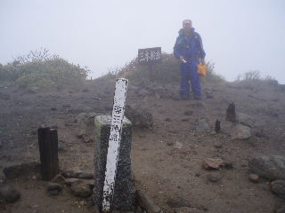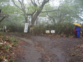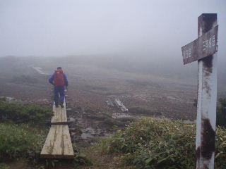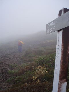 | 茶臼岳と三本槍岳の分岐。ガスの中で遠望が利かず、地図よりはGPSでの現在地確認が正確でした。 | |