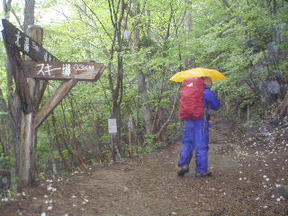 | H21年6月6日(土) 天気;雨のち晴 Member.2人 【コ ー ス】(〜は歩、休憩時間含む。=は乗り物) 北温泉6:25〜中大倉山(スキー場分岐)7:55-8:20〜(休憩9:45-55)〜茶臼岳分岐10:08〜三本槍岳山頂1917m10:41-11:25〜茶臼岳分岐11:52〜朝日岳分岐12:37〜朝日岳山頂12:46-13:15〜峰の茶屋13:45〜ロープウェーバス停14:22-30発=バス350円=北温泉バス停14:40〜北温泉14:55 |