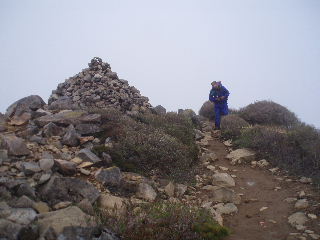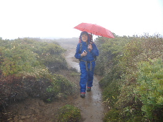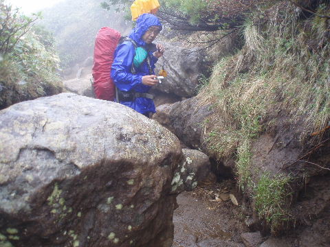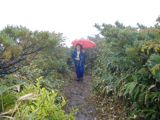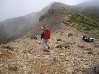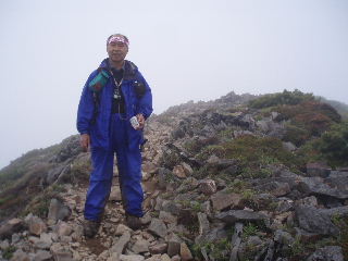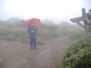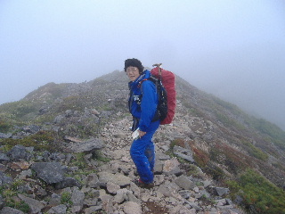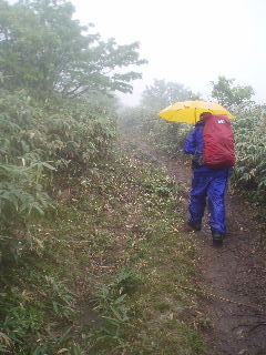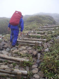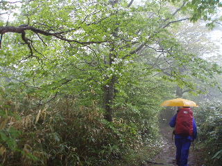 | へとへとです。 雨は止みましたが相変わらずガスって展望はありません。秋(H19年10月)に来た時、展望も紅葉も素晴らしかったのですが、この稜線は今回同様ガスがかかっていたのでした。 相変わらず展望は得られませんでしたが、周囲の様子は分かりますから心の目で楽しみます(^^ゞ |