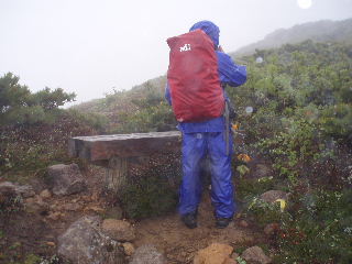 | 雨のベンチで休憩・・・先週の尾瀬も雨のベンチだったっけ。 晴れていれば展望良さそうだけど・・・ 気温13度。朝より低くなっていました。 |