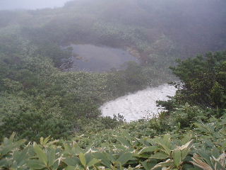 | 眼下に池と雪渓。雪を見たのはここだけ。 | |