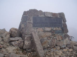 | 三本槍岳山頂。山名のイメージでは北アの槍ヶ岳のように尖がった山峰が三つあるのか?と思ってしまいますが、そんなに急峻ではありません。三本槍とは「昔、会津と那須・黒羽の3藩が国境を確認するため、5月5日の節句にそれぞれの槍を立てたという故事に由来する(コチラ)」ということなのだそうです。 山頂で温かいコーヒーとパンで食事している間に雨は止んできました。その間に登ってきた人は単独2人。ここまでで4人という静かな那須岳(三本槍岳.)でした。 |