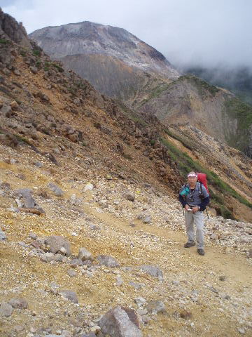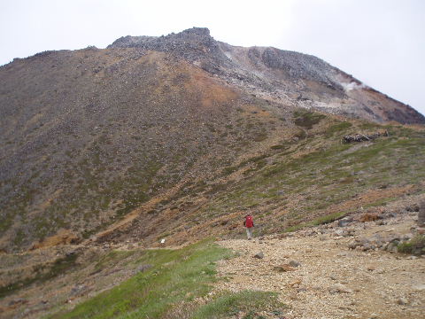 | 茶臼岳に向かって下りることにします。 茶臼は登りませんが(^^ゞ (茶臼岳とトシちゃん) |