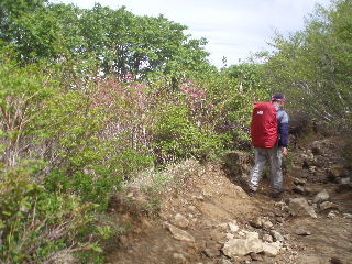 | ハイマツや笹、潅木の間に続く登山道。2000mもない那須連山ですが、積雪期は厳しい雪山となりますからこの稜線も真っ白に覆われてしまうのでしょう。 | |