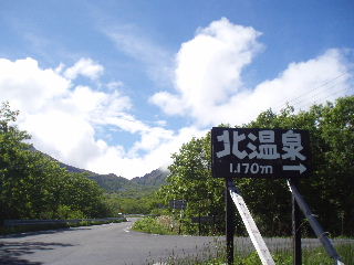 | 北温泉バス停から北温泉までは1170mだそうな!この頃には青空が広がって暑いくらいでした。 | |