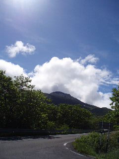 | 茶臼岳の上には相変わらず白い雲がモクモク。でも青い空と太陽の陽射しが朝とは全然違います。 | |