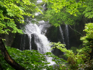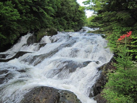 垣間見える竜頭ノ滝を眺めながら。ここの紅葉時期は見事ですね。混みあいますけど・・・ |