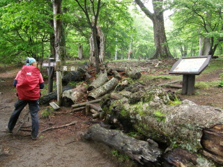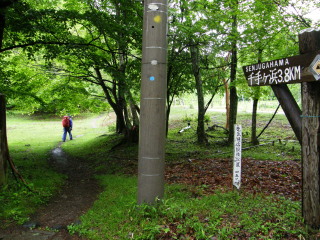 高山分岐。高みに出て北からの風がやや強く、登りで汗をかいた体に心地よい爽やかさでした。 以前は此処から高山ではなく小田代ヶ原へと散策したのでした。 |