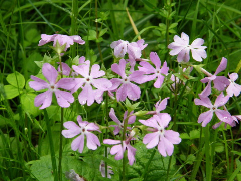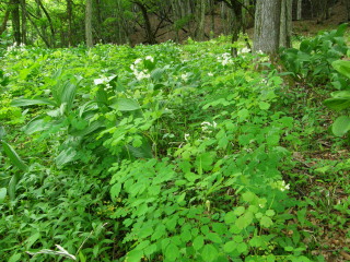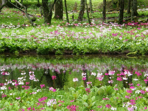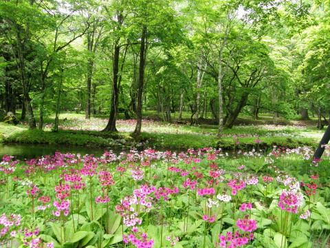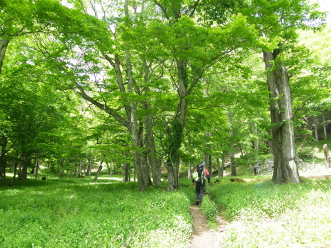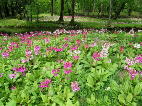 200mほど先のクリンソウ群生地へ。途中の樹林帯や足元に咲くマルバダケブキの若い緑もきれいです。 |