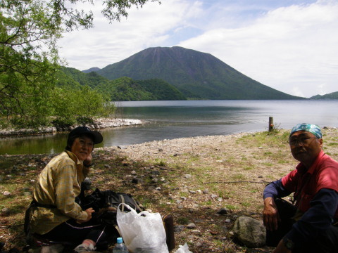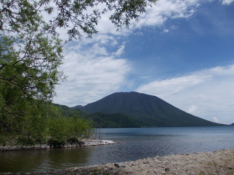 男体山と中禅寺湖。そしてきれいな砂浜。キャンプしたくなるようなロケーションですが、キャンプは禁止です。 |