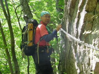 ほんの少し、こんなしっかりした鎖もあります。雪が残っていると断然心強いですが、無雪期ならば、あれば安心無くても大丈夫でしょうという感じです。。 |