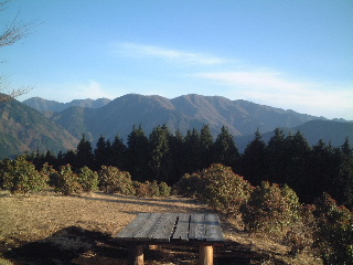 その分岐を過ぎると富士山はもうほとんど見えなかったが、左側や前方の鹿柵の間からは大室山方面、場所によっては蛭ヶ岳方面が見えてくる。それらを眺めながら尾根づたいを左の鹿柵に沿って行けば檜岳へと着く。檜岳手前で少し広いところがあり、鹿柵沿いの登山道を外れると、寄大橋方面へと下りる道があるので落ち葉の多い時期や雪が積もった時は注意が必要かも知れない。檜岳山頂は広く、テーブルのような台がいくつかあった。苔むして座るには冷え冷えした感じだったので、東側の日当たりの良い場所にシートを敷いて昼食。木の間からは鍋割山の稜線が見えた。その頃、今夜ユーシンで合流するだめちゃんやつむぎさんが登っているはずだった。一応携帯でチェック、こちらからもメールを入れる。