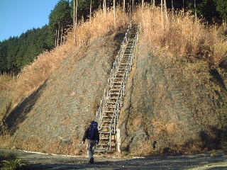 再び目の前の登山道を登るが、そこにはしっかりした階段がついている。枯れススキを掻き分けてずっと鹿柵の脇を通っていく。途中その鹿柵を越えるためか、脚立があった。やがてダルマ沢ノ頭。視界がきかないが、右下に休む場所があったので休憩。そこから200mほど先に行くと分岐がある。秦野峠へは右に下りていく。しかし秦野峠と書かれた部分がとれて下に落ちているので通過してしまわないように要注意。そのまままっすぐ行くと高松山へと行ってしまう。