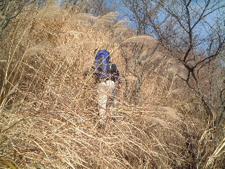 下る途中、作業道らしき脇道があるので要注意。視界がきかないときは間違いやすいかもしれない。植林の中を行き、枯れたススキを掻き分けて進んでいく。枯れススキと夫の後ろ姿が妙にマッチして見えるのはなぜ?哀愁と見るにはかけ離れてはいるけれど・・・。登山道はしっかりついているが、雪が降ったり、ススキが青々と繁る頃は進むのが大変そうだ。このススキ、この先もずっと続く。たまに咲き残っている足下の白い菊が可愛いかった。いったん林道へと下りる。意外ときつい登り下りだ。