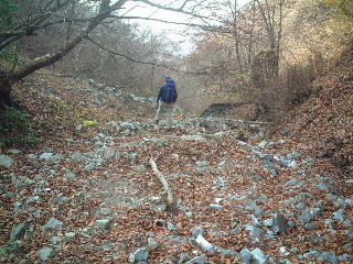 雨山峠から雨山沢の方へ下る。大雨の時はここも流れがあるのだろう、沢沿いには梯子やら補助道やら整備されていた。紅葉の時期はきれいだったのではないだろうか、落ち葉が多かった。途中単独者とすれ違う。