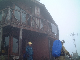 よく見れば確かに雨の中に雪が混じっている。みぞれだ。登るほどに雪に変わっていった。水場を過ぎると山頂は近い。山頂にはうっすらと積もっているところがあった。「わーい、雪だ」展望はなくとも何という幸運。思わずメールをいれる。ストックの忘れ物情報も添えて。