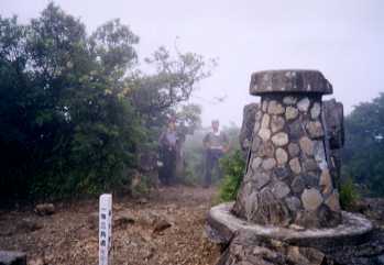 H13年8月11日(土)前夜登山口着天気;曇り時々雨 Member.3人(夫婦、娘) 【コ ー ス 】 北谷登山口5:35〜千間平6:35-40〜国観峠?〜祖母山山頂8:25-9:10〜国観峠?〜千間平10:25-30〜登山口11:25 【祖母山山頂で】右 2001年夏休みは家族三人で九州旅行(8/9夜川崎発〜8/21朝川崎着)をし、観光と山行を楽しみました。山行時天候が不安定なときが多く、展望にはあまり恵まれませんでした。遠方ゆえ休みの都合で仕方ありませんが。お花もちょうど寂しい時期で、当初の予定の9月または5月の連休の頃訪れられなかったのが悔やまれました。九州の夏はさぞや暑いだろうと思っていましたら、意外にも涼しかったのでそれはラッキーでした。 遠いためなかなか行けない九州へ、今回思い切って家族3人で長期旅行することにした。というのも末っ子の娘が大学4年で来春卒業見込みのため、就職すればこうして一緒に出かけられなくなるだろうという思いがあったからだ。娘は娘で、親孝行のつもりなのか、いつもは嫌がる山行プランに、あまり文句を言わない。そして意外にも一緒に沢山歩くことができた。夫と娘に感謝である。 九州までの往復は川崎〜日向間のフェリーを利用、車1台と2等寝台3名分、そして宿を2泊分セットで15万円。格安だ。しかし帰路は大型台風出現でフェリーが欠航になり、陸路を帰ることになってしまったが・・・。 こうして翌10日夕方に日向港着岸。一路祖母山登山口へと向かう。今回もまたほとんどが車中泊(キャンピング仕様のハイエース)だ。 登山口は北谷登山口。移動時間を考え、最短のコースを選んだが、五ヶ所から登山口までの林道は狭く、対向車との交差スペースも少なかった。運転は途中で娘から夫に代わり、ライト点灯で対向車が確認しやすい夜ならではの安心感の中を走っていった。 北谷登山口の駐車スペースは思ったより広かった。10台ちょっと置けそうだ。トイレも水道も屋根付きの休憩場所もある。しかもトイレはペーパー付きだった。大野川源流の碑が建っている。大分県南部を流れ、別府湾へと注ぐ川となる。登山口は宮崎県になるが、途中で宮崎、熊本、大分の3県の県境を通り、山頂は宮崎と大分の県境になる。 朝4時半頃起きるとまだ暗い。立秋を過ぎると夜明けはこんなにも急速に遅くなるものか。日頃起きるのが遅く、また半月ばかり山に行っていなかったので、その日照の短縮の早さにこの時になって驚いた。 登山口を5時半過ぎに出発。薄明るいのだが、木立に覆われた登山道はまだ薄暗く感じる。ヘッデンは勿論いらない。先頭は元気の良い娘。だが、大きなカエルがいて、何回かそのたびに悲鳴をあげている。その上蜘蛛の巣が顔にかかったりして、初日から賑やかな山行だ。 手に竹をもって、蜘蛛の巣を払いながら進む事を覚え、それからはまた快調に進んでいく。 千間平は名前から来るイメージのような広さはなかった。大きなテント1〜2張り、張れる程度だ。左側には道らしき踏み跡がある。先は鮮明かどうか分からないが、西側方面へと伸びる登山道かあるいはキジ場か定かではない。そこで少し休憩。 千間平から少し下ると、やがて宮崎、熊本、大分の県境がある。ここも左方面へ道が延びているようだった。広い場所でも展望が良いわけでもない普通の通過地点だったのでそのまま素通りする。緩やかなアップダウンを繰り返して行くが、ずーっと笹藪に両サイド挟まれ、ほとんど見通しがきかないコースだった。そして夜露でズボンの裾が濡れてくる。 眼前がぱっと開けたところは国観峠で、けっこう広い。神原からの登山道と合流する場所でもある。そこから見る山頂方面はガスっていた。 いよいよ山頂へ登りつめる。雨がポツポツ降ってきたが時折青空ものぞく。不安定な天候だったが合羽を着るほどではなかった。道はぬかるんでいるところが多く、ここへ来て滑りやすくなってきた。危険ではないが登山道の崩れているところがいくつかある。相変わらず木や笹藪で見通しは利かず、蒸し暑く感じながら石のごろごろしている登山道を登っていくが、一貫してあまり楽しいコースではなかった。九合目には小屋があるようだがそちらは通らなかったので様子は分からない。 ひょいと山頂の一角に辿り着き、空気の流れを感じて思わずホッとした。百名山の一つというからには展望は良いはずなのだがガスで遠望はきかない。写真を写した後、コーヒーをいれ、クロワッサンサンドを作って食べながら、ガスの晴れるのを待った。しかし、わずかに一瞬、歩いてきた側の尾根が見えただけだった。展望は諦めて同ルートを下山。 国観峠で振り返ると少し姿を見せていたが山頂は相変わらずガスがかかっていた。ひとまず写真を写して通過。 登りでは誰にも出会わなかったが、下りでは下に着くまでに10組くらいの2人連れや家族連れに出会った。 お花はこの時期少なく、終わりかかっているノリウツギやウツボグサなどがわずかに見られた。名前の分からぬ下草もい