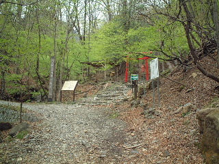 約1時間は林道歩きだが、今回は全行程でも2時間ちょっとだから苦にはならない。雪道で一度は通ったことのある場所だ。風景は一転して新緑で美しい。山桜、山吹、ミツバツツジなどで彩られ楽しい気持ちにすらなってくる。写真を撮りながら1時間弱で一の鳥居に到着。この間、釣り人の車が何台か見かけた。銀山平にはゲートがあって閉まっているのだが、何故か開けられる人もいる。 一の鳥居で少し休憩し、今度は山道を登っていく。周辺はやはり新緑が素晴らしい。鏡岩や夫婦蛙岩、仁王門など通過するにしたがい緑はなくなっていった。しかし見上げると山の上の方にヤシオツツジが咲き始めていた。 ゆっくり歩いても庚申山荘には2時間半とかからずに着いてしまった。ここまでに積雪は全くなかった。時間がまだ早いから、少し先まで登り、ツエルトでビバーク体験をしようかという案も出た。しかし雪もまだ残って上の方は寒いという事だったので、翌日の長丁場を考え予定通り山荘泊まりとする。 山荘の中は広く、布団が充分ある。管理人はいないがきれいに使われている。自炊室には水道が二つ取り付けられており、外のトイレの側にも水道がある。トイレもきれいだった。利用料は一人2000円、これは安い。用紙に記入して料金箱に一緒に投函。あとから領収書が送られてくるそうだ。