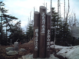 鋸山に着いたとき、皇海山はガスの中だった。皇海山は目の鼻の先だが、夫は疲れたらしく、ここでもう待ってるよと言いだした。しかしもう少しだからと下りにかかった。この下りは雪が沢山ついていて注意が必要だと聞いていた。雪のない山頂近辺や、岩場を下り、急斜面の雪面を見たときなるほど・・・と思った。この時はまだアイゼンはつけていなかった。少しキックステップで下りていったが、軽登山靴では不安を感じ、私は樹林の方へ寄っていった。先を行っている夫は尚もキックステップで下りようとし、目の前であっという間に滑ってしまった。側の木を掴んだがするりと抜けてしまい、加速して落ちていく。ザックで体の向きが変わり、滑っていく様を上からただ見つめているしか出来ない。「自分でなんとかせい」と怒鳴りたくなるほどだったが、一瞬のことで実際私はその時何も出来なかった。下の木の所で緩やかに停止し、夫のホッとしたような声が聞こえて、やっとこっちも安堵した。約10m滑落。雪の急斜面をそんなに急いで下りずとも、右手の樹林に登山道があったものを・・・ 夫の側に行くと「ウエストバックが切れちゃった・・・」。ともかく体に怪我はなかったようで安心した。ザックの中身をこちらに少し移し、ウエストバックを入れるスペースを空けた。急斜面をとりあえず下り、次のピークに着いたとき、「やはり皇海山は一人で行って来いよ」と夫。鋸山頂で待っているという。今度は樹林の中をゆっくり注意して登るというので、そこから一人で皇海山山頂へと向かった。 この日鋸山から皇海山までは雪がまだいっぱい残っていた。多いところでは1mくらいはあっただろう。登山道は殆ど消えていたのでコメツガなどの樹林帯の中、方向を見誤らないように、慎重に登っていった。こういうとき、人の足跡ほどあてにならないものはない。それにしても疲れた・・・・。ペースが落ちているのが自分でも分かる。途中でアイゼンを装着した。