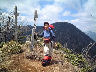 薬師岳に着き、改めて前方に聳える鋸山方向を眺める。雪の時は近寄りがたかったが今回は手招きしているようだ。ここで前夜庚申山荘で一緒だった福井のご夫婦が到着。私たちが山荘を出る頃、彼等は食事するところだったのに早い。荷はナップザックのような感じだったから、極力軽くしてきたようだ。小屋にもどるのだからそれでも良かったのかも知れない。 今回の私たちの主な装備はツエルト・無線機・携帯・ロープ・コッヘル・ガス・カートリッジ・デジカメ・救急用品等が共同、6本爪軽アイゼン・飲み物・食料・ヘッドランプ・予備電池・雨具・シュリンゲ2・カラビナ2-3・フリースなどが個人装備だった。他にナイフや地図諸々細かいものが入る。今回のコースは鎖場や荒れた岩場などあるということだったので、これでも減らしたのだが、実際歩いてみて、まだまだ甘かった。しかし有事の場合を考えると最小限でもある。 服装は春山だが、残雪や沢の徒渉もあるのでスパッツははじめから装着(これは正解)。ピッケルはやめてストックを持った(これも正解、しかし鎖場では要注意)。ここまでの残雪の状態は、既に解けているところもあるが、樹林帯の中などはまだ40〜50センチは残っていた。気温が低いので締まって歩きやすかったが、たまに踏み抜くと膝上まで埋まるところもあった。これからは陽気が良くなる一方だし、雨でも降れば、しばらくは雪が腐って歩きにくくなるのだろう。