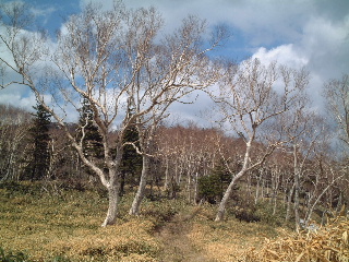準備して六林班峠へ。多少のアップダウンはあるが、白樺林やブナ林、クマザサなどの中を歩けて気持の良い稜線だった。夫はゆっくり休憩したお陰で元気が出ていた。調子よく夫の後をついていったが、途中でまたもやルートを見失った。夫が先行者の単独男性の足跡をついていったためだった。おかしいと思ったところで見覚えのあるその男性の手袋を片方拾い、分かったわけだが、その後を疑いもせずについていった私、まったく懲りていなかった。夫といえど、こういうときは信じてはいけない、自分の目で確認して進まなければいけないと肝に銘じる(^o^)(^o^)(^o^)