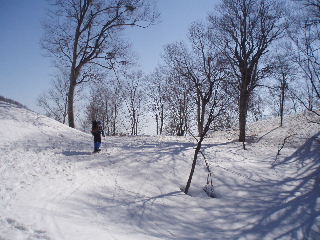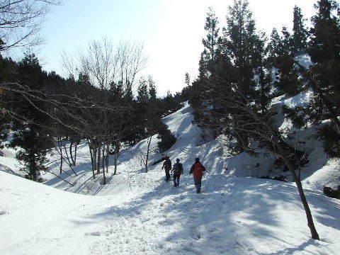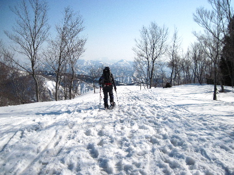 | 林の尾根を登って行きますが、既に大勢の人が入っていますからトレースはバッチリ。 |