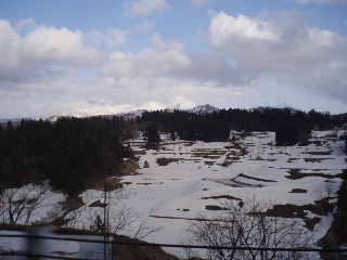 前日の角田山からその日の内に二口の登山口へと向かいます。長岡ICから下りて、懐かしい魚沼市(以前来た時は魚沼郡でした)に入ると、あたり一面まだ雪景色。その奥に裾野が少し見えていた守門岳ですが、カメラを向けた時は雲の中。お姿は明日のお楽しみに。 |