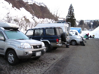 温泉と夕食を済ませ、前夜早めに除雪終了地点まで来ました。わずかに空いていた駐車スペースはすぐに埋まり、ホッと胸をなでおろします。