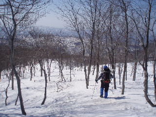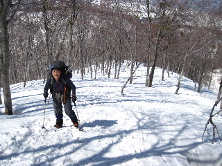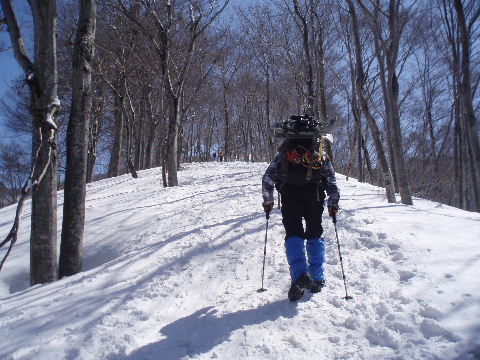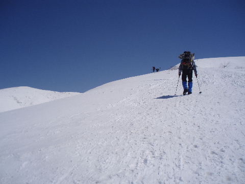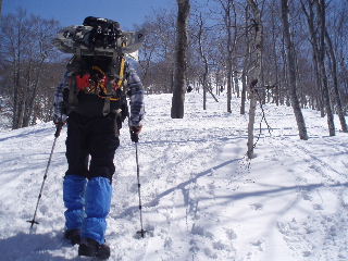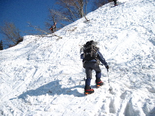 スキーを担いで登っていくお二人に続いて、私達もアイゼンを履いた強みでガシガシと直登していきます(アイゼンは間もなく外しました。今回は無くても大丈夫でしたが、気象条件や時間帯、雪の状態によって違いますので、アイゼンやスノーシューまたはわかんはその都度ご判断ください)。 |