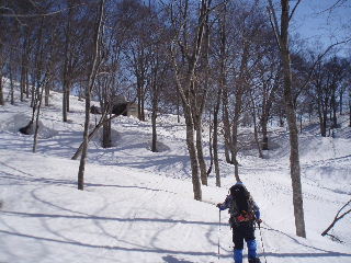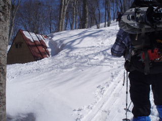 この日は大勢の人が入り、以前からのトレースもしっかりあったため、それを辿って行くと保久礼小屋までは長峰を通っていくことに今更ながら気付くことになりました。これも毎年残雪状況によって違うようですから、やはり最新情報あるいは現地に行ってみないと分からないこともあります。麓の取り付き口は特に変化が著しいでしょう。 |