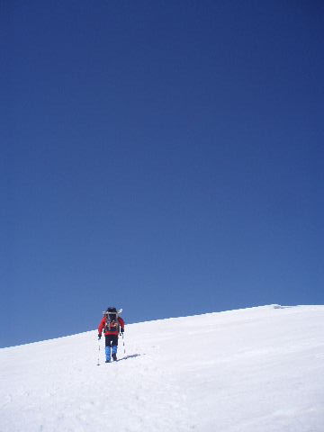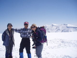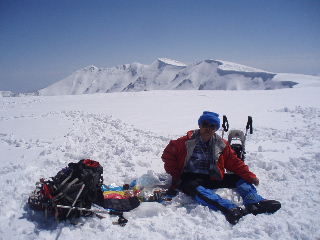 暑くて一枚脱ぎ、二枚脱ぎ、私は薄い長袖一枚でした。こんな雪山なのに、そのくらい暑い一日でした。陽射しが強く、風もほとんどなく、日焼け止めを朝一回塗ったくらいでは歯止めが利かない日焼け・雪焼けで真っ黒になるとは、迂闊にもこの頃はまだ思いもせず・・・