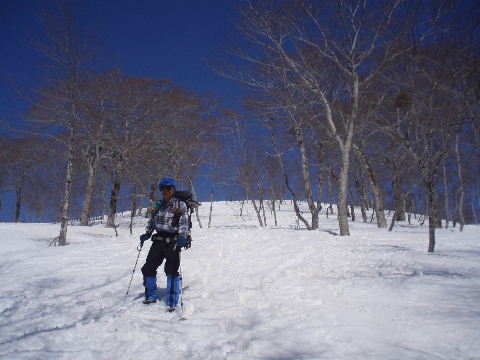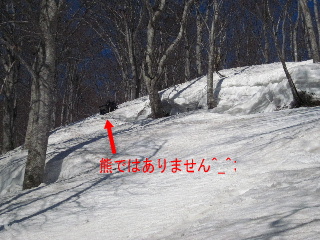 尾根から保久礼小屋方面に下りていくところでやや急斜面になったため、一旦スノーシューを脱ぎました(しばらく履いたまま下りていったのですが、水っぽいシャリシャリ雪で滑ってしまい、すぐに止まれず木にドスン!木を倒すことはしませんでしたけど^_^; さすがに危ないと思いまして(汗;)