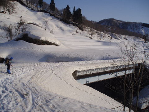 | 守門岳を眺めながら西川を渡りますが、その西川の縁にはこんなに厚い雪の層。この時期、村ではいつもなら残雪50センチくらいだそうで、今年はそれより1m多い、1m50センチくらいは残っているということでした。 |