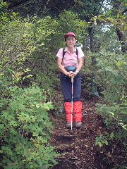 山頂で一休みしている間に東側のガスがすこしとれ、山並みが見えてきた。開放部はそちらだけで方角的に小楢山の方かなと思ったが、山頂部分がガスっているため山座同定は確信が持てなかった。空模様が気になったので同ルートを下山することにする。急登の所を下るのは大変だがストックが心強い。濡れて滑りやすい木の根にも注意。