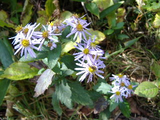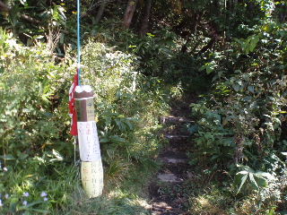 | 一旦舗装道路に出て、再び登山口です。 ペットの持ち込み自粛・・・トシちゃんダメだって!(冗談ですってば!(^^ゞ) 昆虫、植物の採集禁止・・・これはもう当然ですよね。 ノコンギクがたくさん咲いています。 |