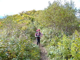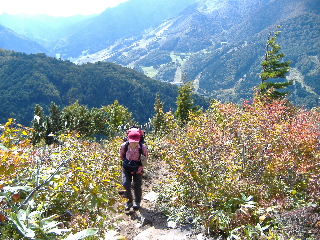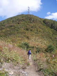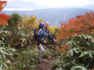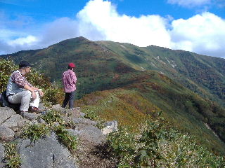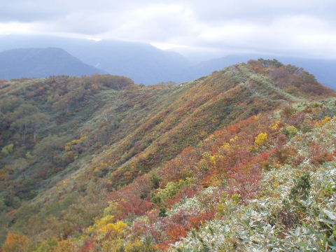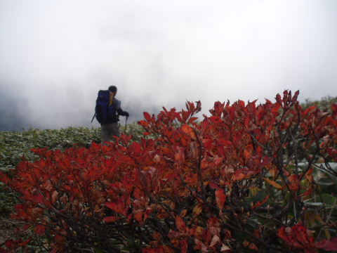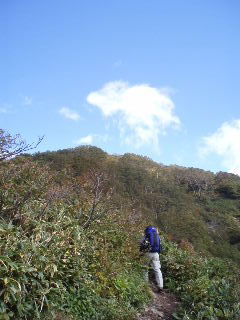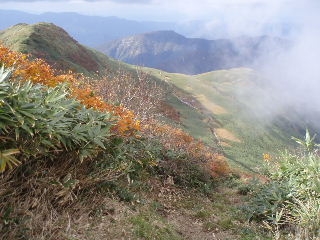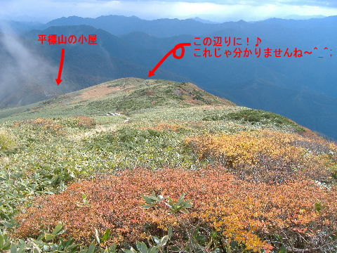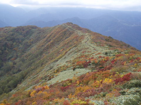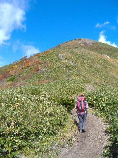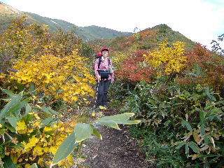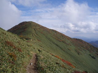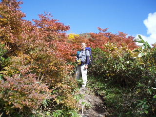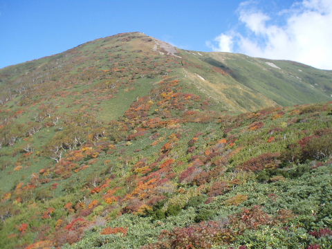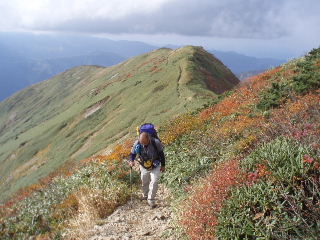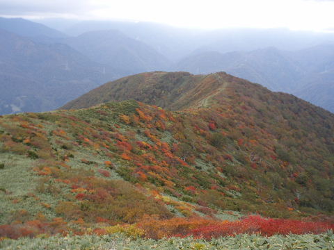 | 前方が開けて平標山が見えてくると、その山肌に思わず二人とも驚きの声!予想外の紅葉でした。 | |||||