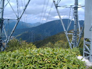 | 山頂展望2:南方面。大源太山、三国山へ稜線が延びています。今回こちらも候補に挙がっていたコースでした。 鞍部には山ノ家が見えます。新しく建て替えられたばかりでまだ見ていませんが、今回は同ルートを戻るので拝見するのはお預け(トイレは水洗になったそうです)。ところが、ここを下りていれば思わぬ遭遇があったと後日分かったのです。 |