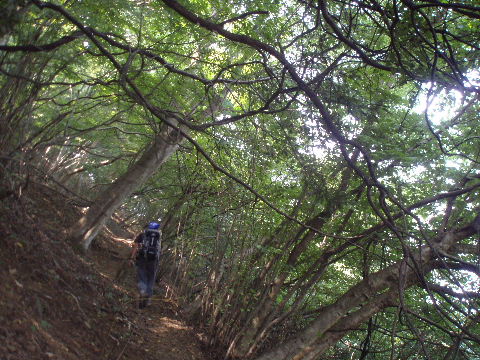 ここからは尾根伝いに歩きます。いくつか小ピークのアップダウンですが、話しながら歩いていたらあまり気になりませんでした。このときの話題は法や判例など都合のいい解釈をする人の話だったような・・・。山では仕事の話はしないようにしていますが、近頃のニュースの話からつながってしまいました。こういう話になると熱くなります(笑) |
